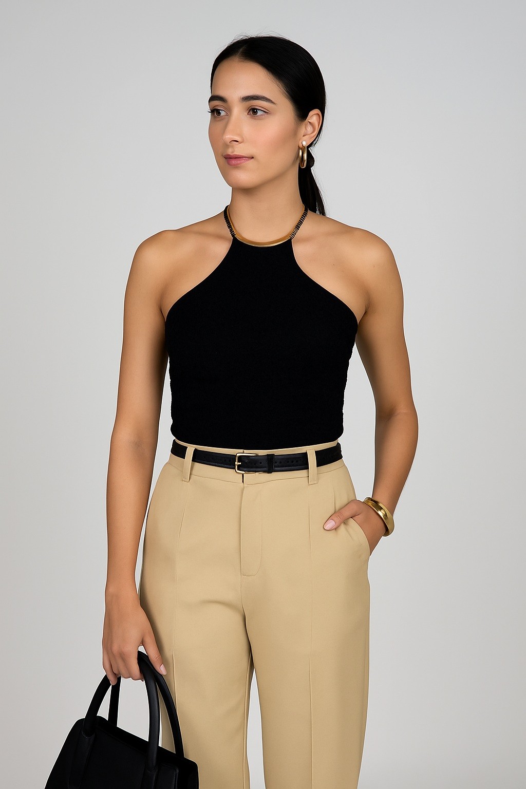 Nos acessórios, um colar mais estruturado ou uma bolsa de couro com design minimalista ajudam a reforçar a proposta sofisticada.