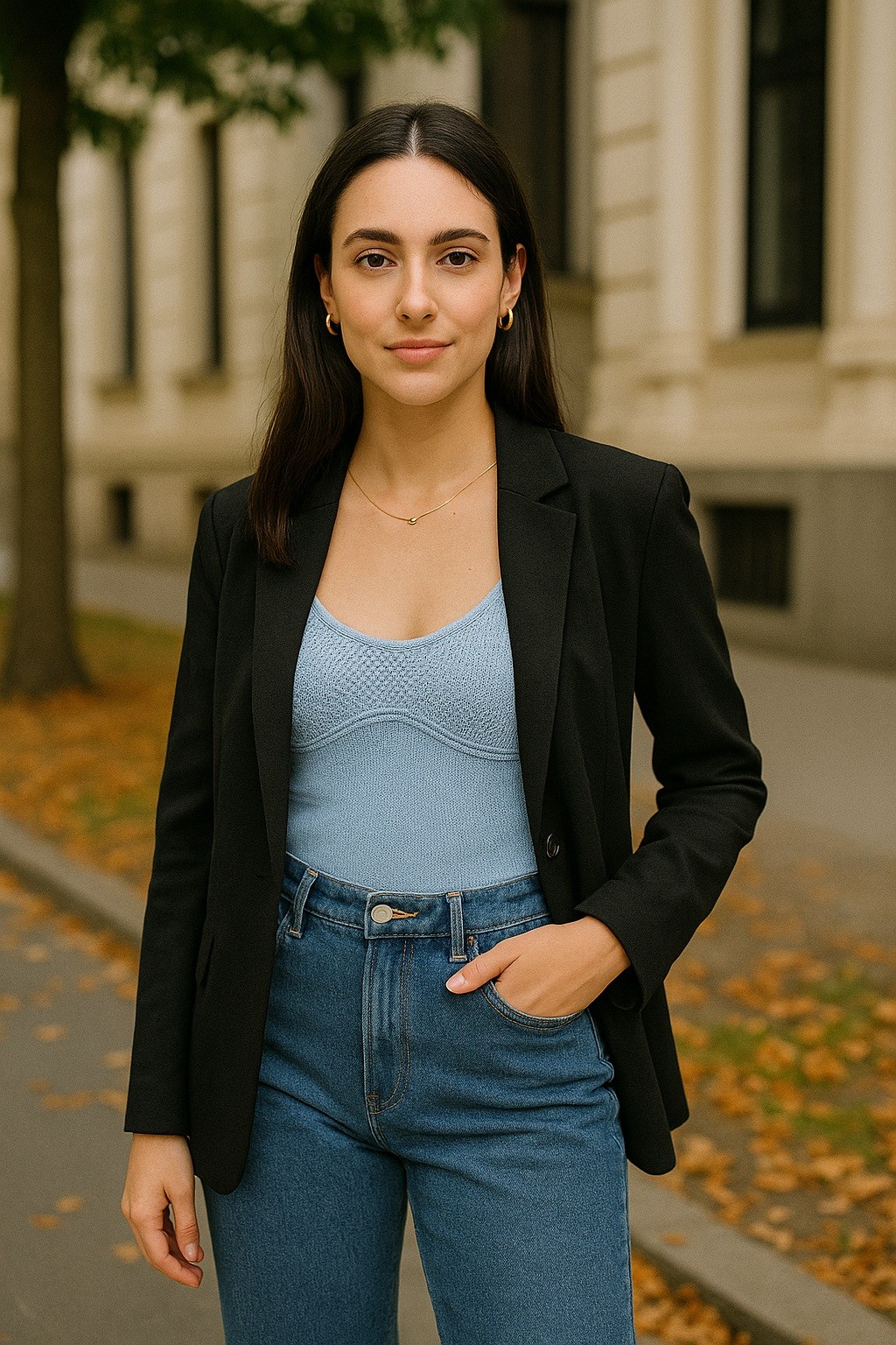Esse contraste entre o estruturado e o solto dá ao visual uma aparência sofisticada sem esforço, perfeita para momentos como encontros, passeios no fim de semana, idas ao teatro, ou até como alternativa charmosa para ambientes de trabalho informais.
